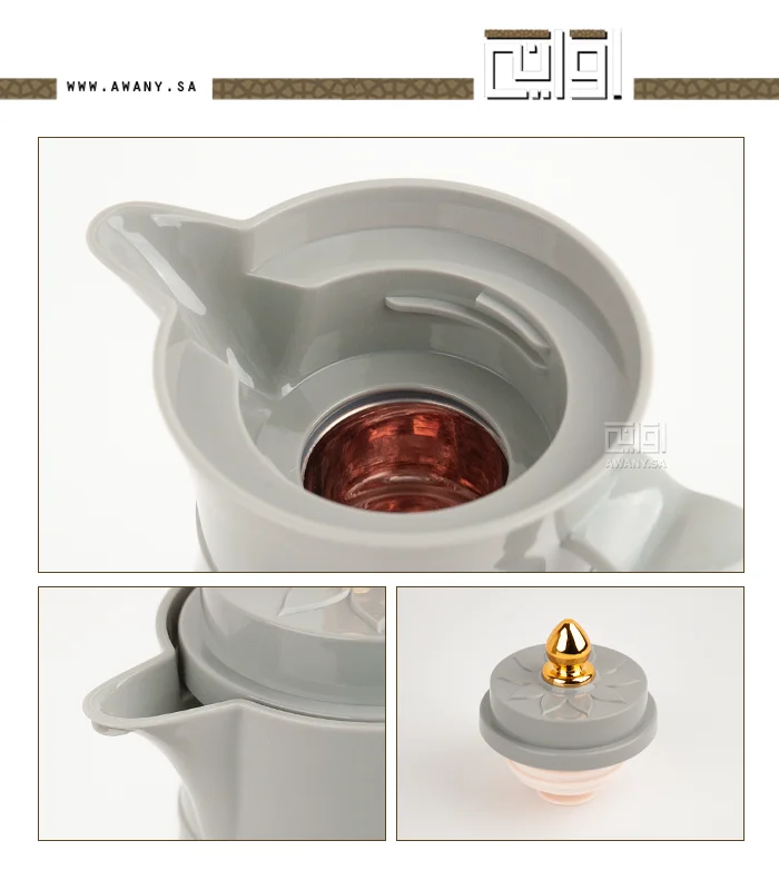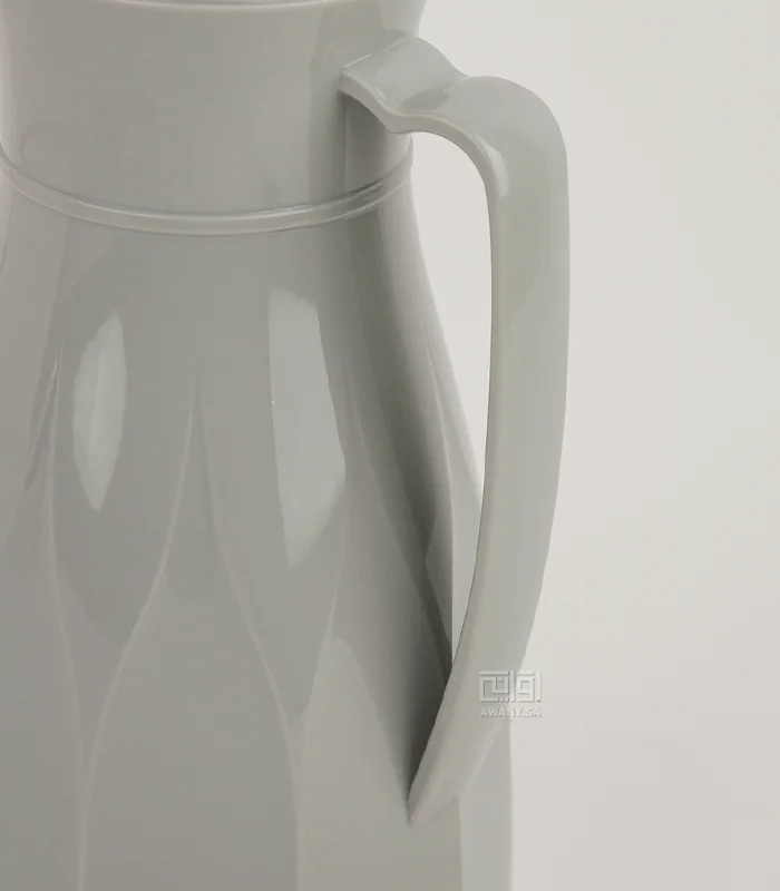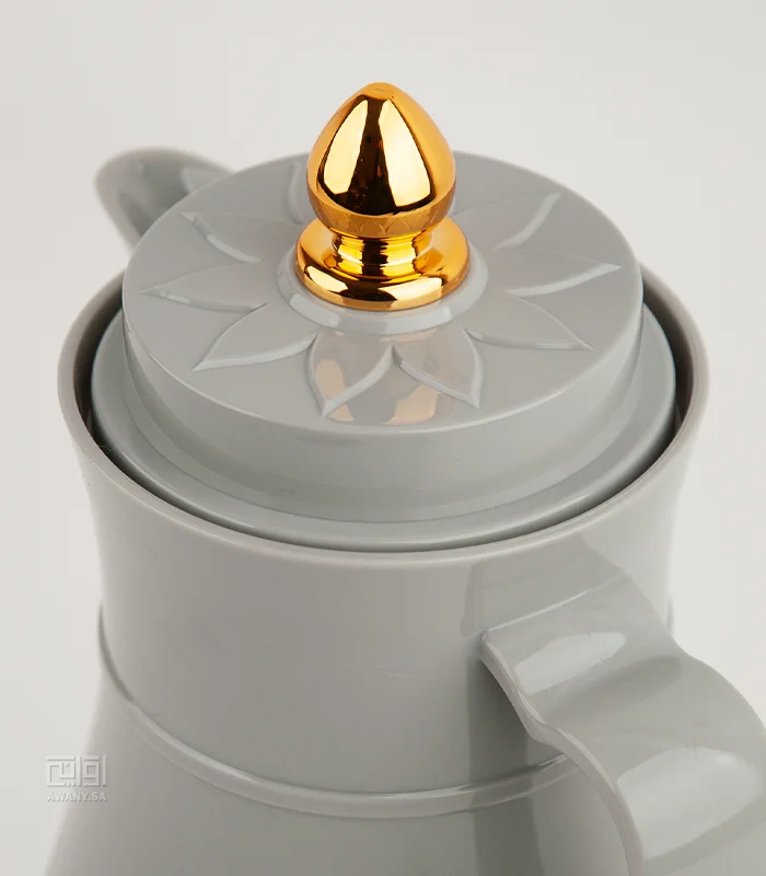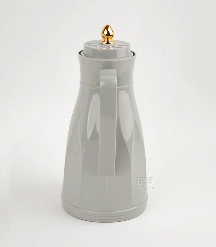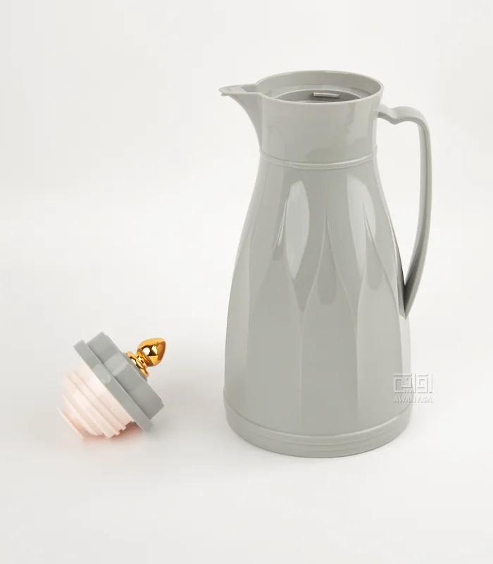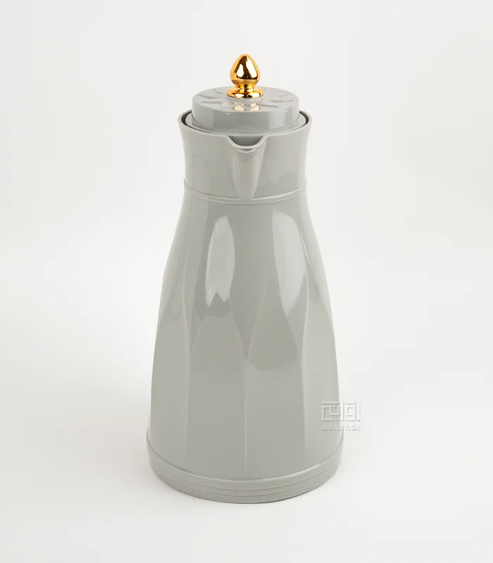 أضيفي قطع جذابة ألى طاولتك، ترمس بطراز عصري أنيق، مصنوع من البلاستيك، من الداخل زجاج مقاوم للحرارة، سعة الترامس 1 لتر، لون رمادي هادئ، مقبض ذهبي على الغطاء وزخارف جميلة.