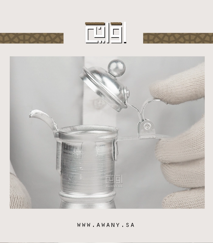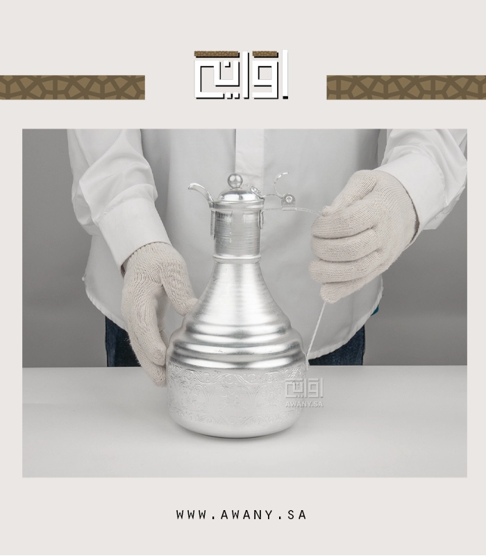 دلة معدن تراثية منقوشة رسالة ترحيب بضيوفك، تصميم مميز و ملفت للأنظار، مصنوعة من خامات معدن الالمنيوم، لون فضي لامع يعكس احساسك بالنقاء والفخامة، زخارف على قاعدة الدلة محفورة بدقة تضيف عمقاُ بصرياً ولمسة تراثية.