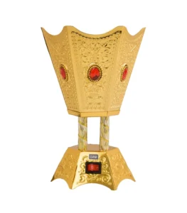 مبخرة كهربائية، بتصميم على شكل هرم بالجزء العلوي، زخارف مستوحاة من الطابع الشرقي، خامة من المعدن مطلية بلون اصفر خاطف للأنظار، تحيط بها كريستالات حمراء تضفي لمسة فنية لضيافتك.