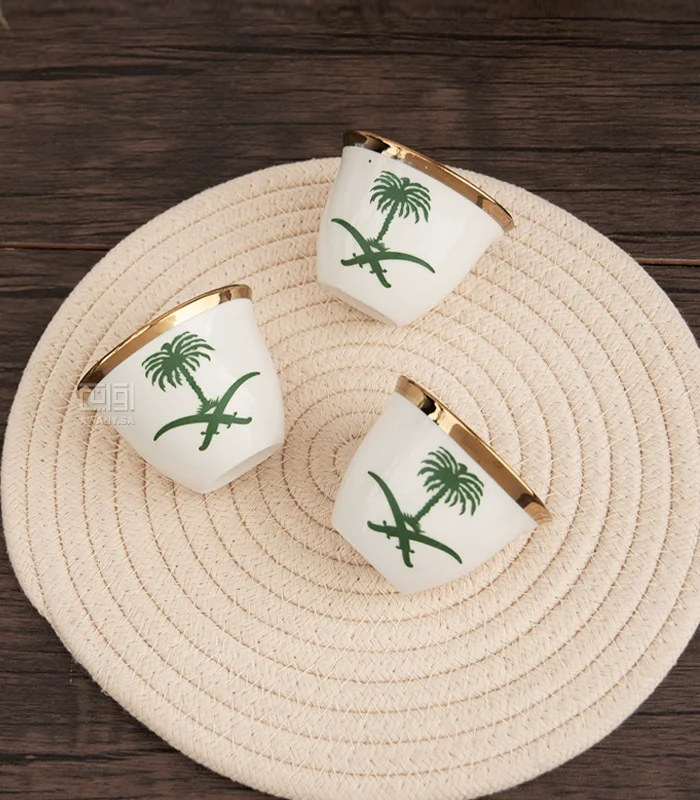 تفنني بأسلوب ضيافتك بطريقة يحبها قلبك، مع فناجين القهوة، المصنوعة من السيراميك بلونها الأبيض وحوافها المذهبة، التي تتميز بنمط وتصميم شعار المملكة (السيفين والنخلة) زابهري ضيوفك بذوقك الرفيع.