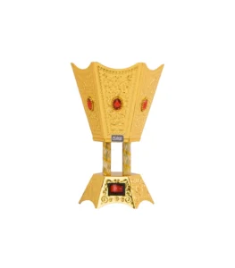 مبخر كهربائي بتصميم عصري يجمع بين الأناقة والفخامة، خامة المبخرة من المعدن، هيكل هرمي يتميز بالزخارف الشرقية على كافة جدار المبخر، مع لمسات من الأحجار الزرقاء، مزود بمفتاح لتشغيل والايقاف، قطعة مثالية لتزيين المجالس.