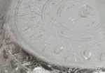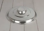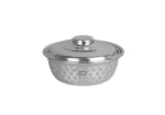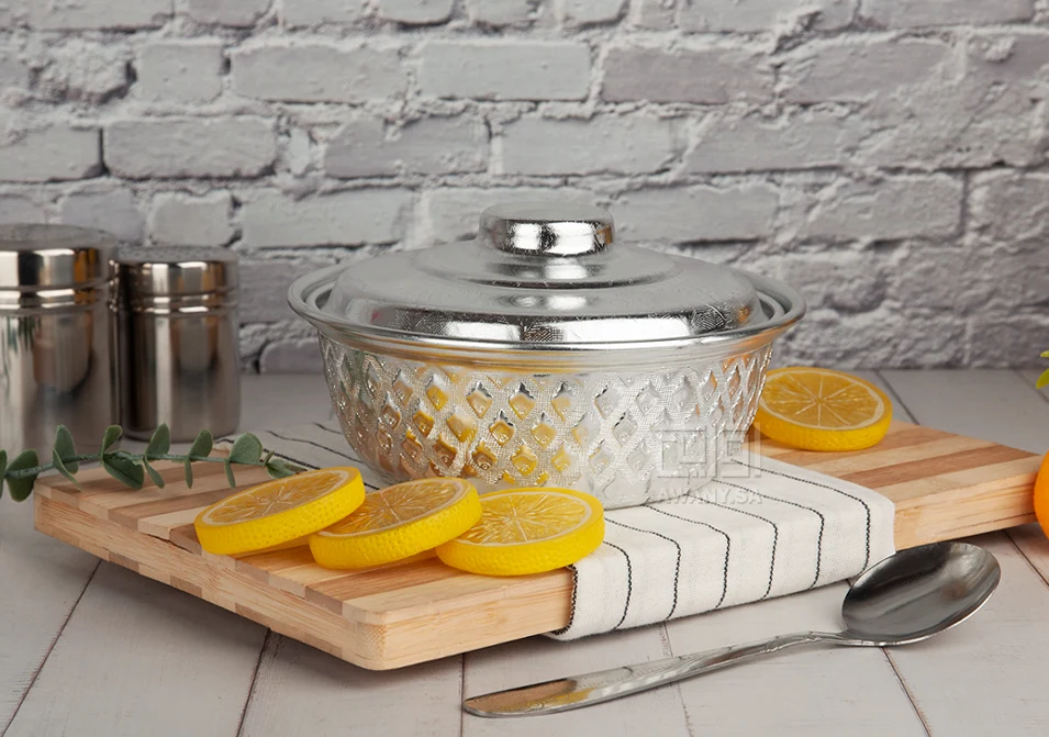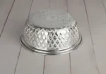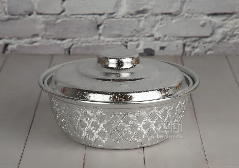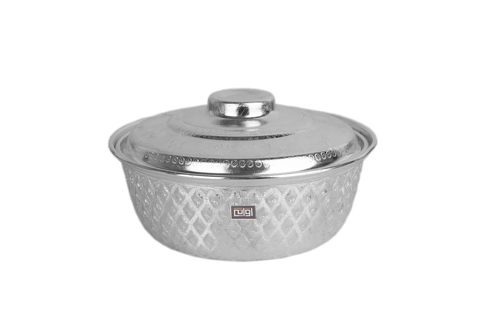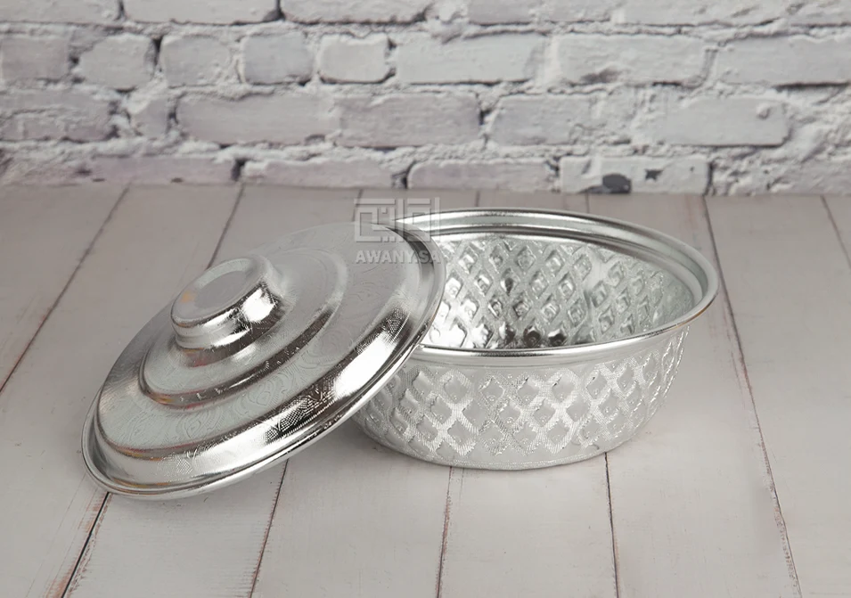 بادية تقديم معدن بلمسة تايلندية، خامة مصنوعة من المعادن، لون فضي لامع، تصميم دائري بغطى، نقوش بارزة على هيكل القطعة مستوحاة من الفنون التايلندية، رائعة لتقديم لاكلات الشعبية.