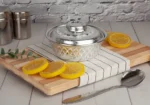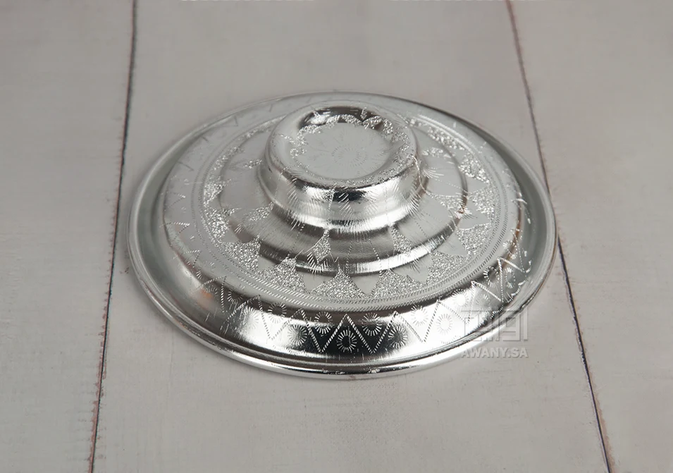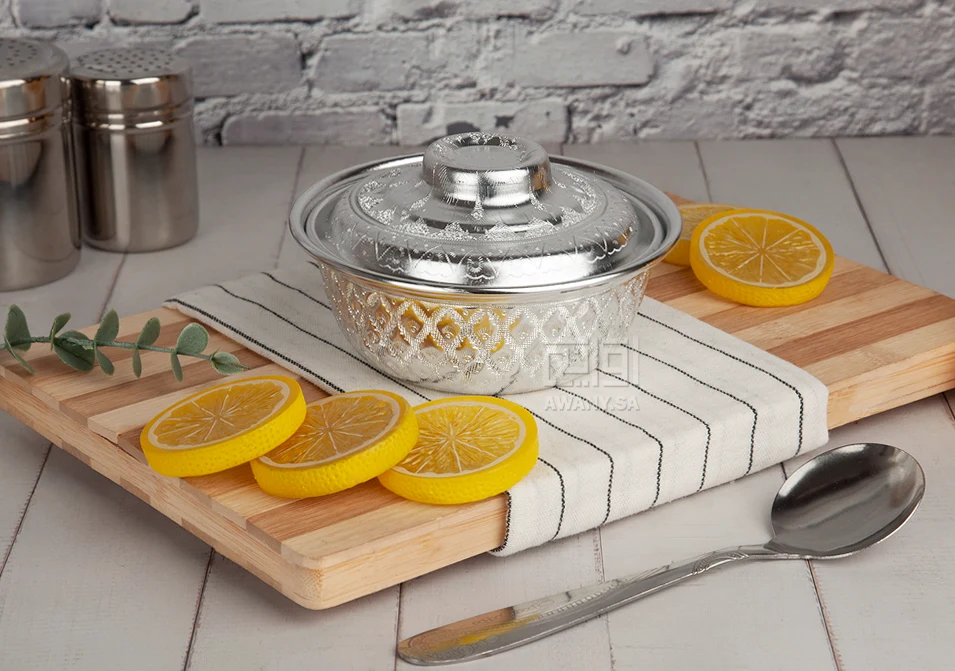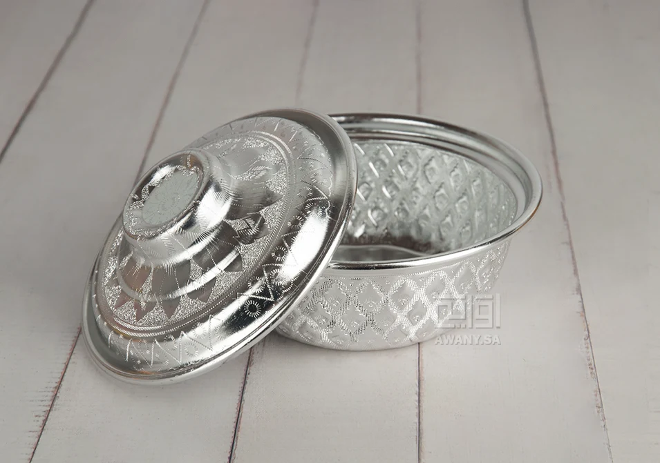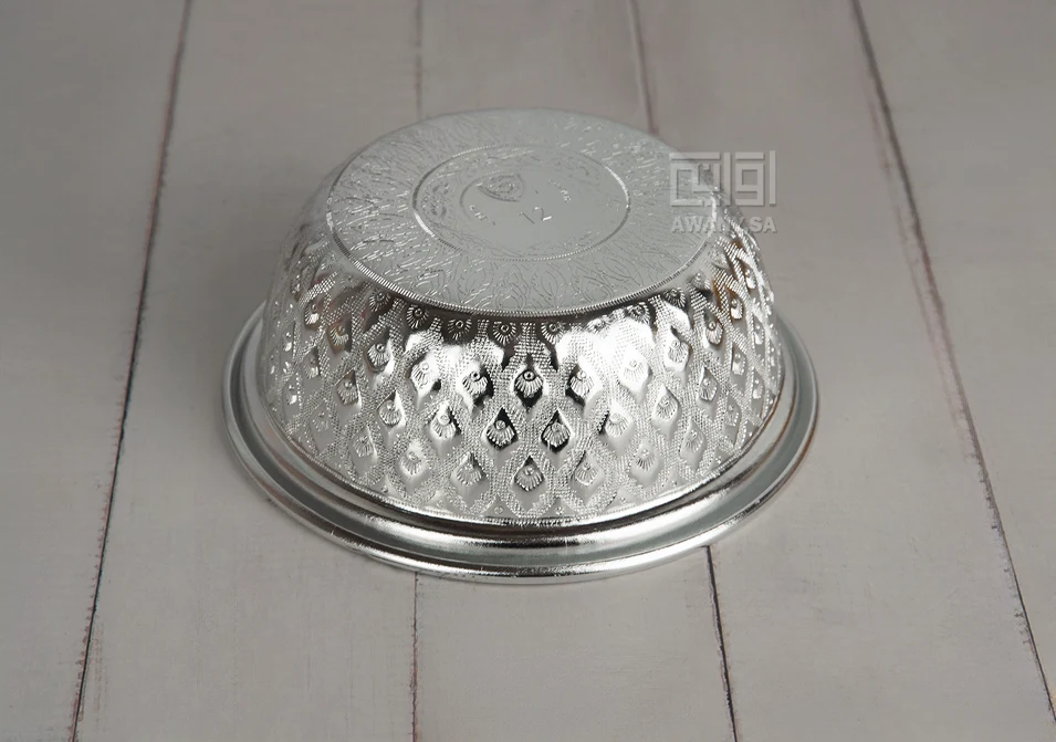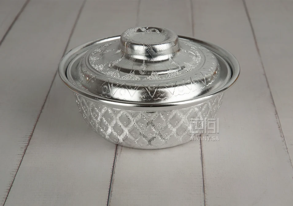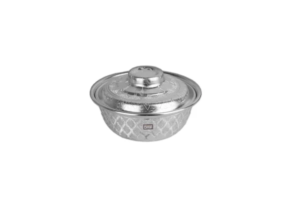 بادية تقديم معدن، دائرية قطر 12 سم، مزودة بغطاء، لون فضي لامع، مزخرفة بنقوش تايلندية بارزة ومميزة، رائعة لتقديم الشوربة والأكلات الشعبية المتنوعة.