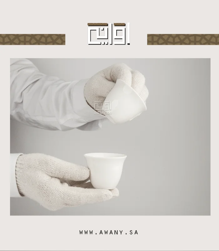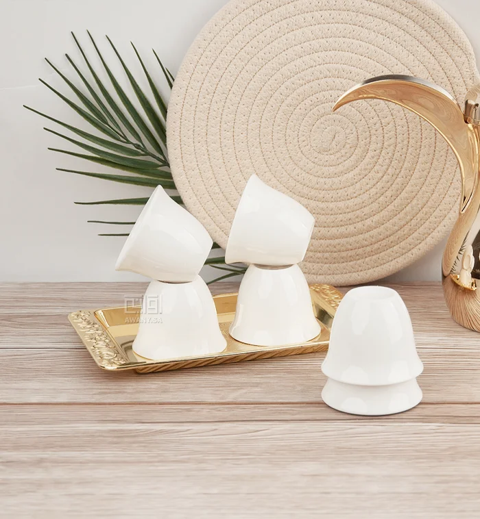 فناجين القهوة العربية البيضاء بتصميمها السادة، بساطة ورقي كلاسيكي، خامة من البورسلان، نقاء وصفاء لضيافة العربية.