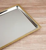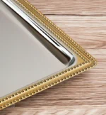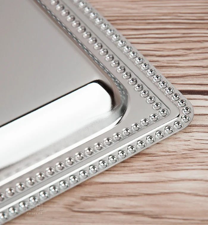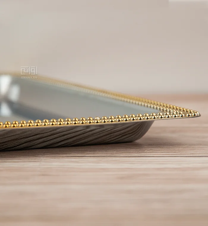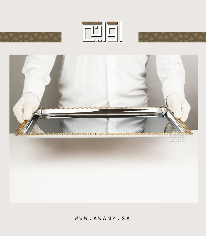 طوفرية بمزيج من الأناقة والفخامة بلمسة عصرية، خامة من الستانلس ستيل اللامع، لون فضي بإطار ذهبي مزخرف بدقة، طوفرية تجعل كل مناسبة احتفالا خاص.