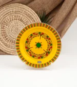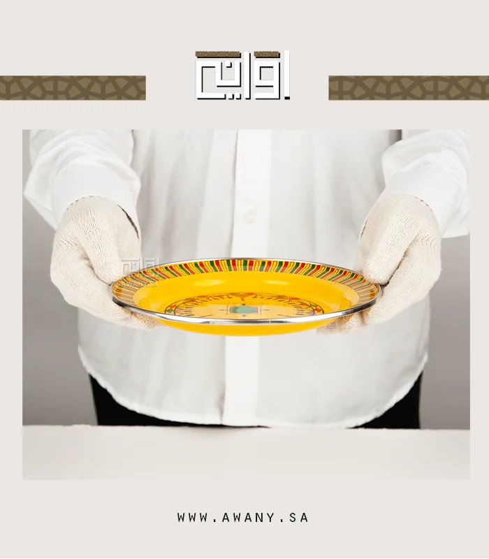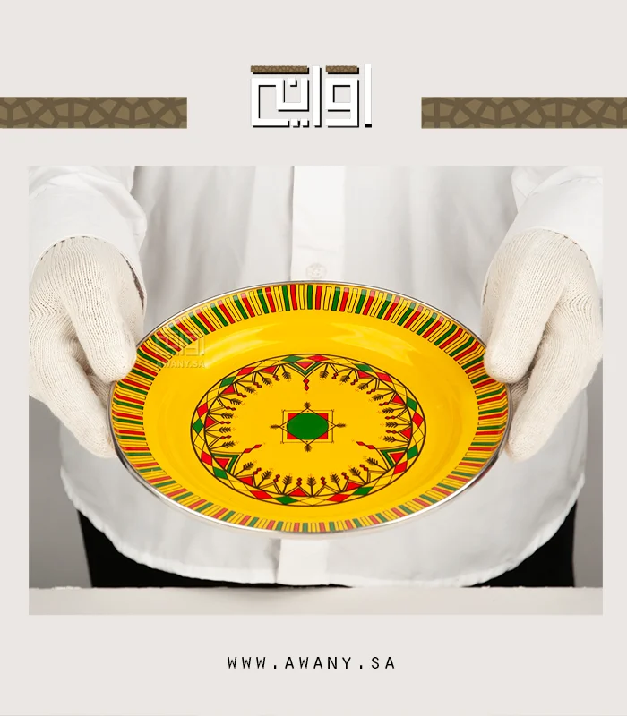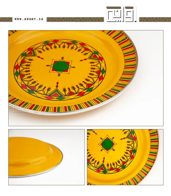 قدمها بفن عسيري تبسي شعبي غضار اصفر،  دائري مصنوع مادة الغضار، شكل تراثي قديم بعمق بسيط، قطر 21 سم ، مما يميز التبسي النقش العسيري با أنماط هندسي رائعة، مثالي للاستخدام المتكرر.