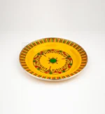 صحن تراثي، مصمم بشكل دائري وعمق بسيط، مطلي بمواد الغضار، يتميز بزخارف الورد بألوانها الزاهية.