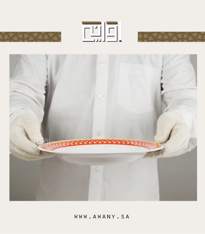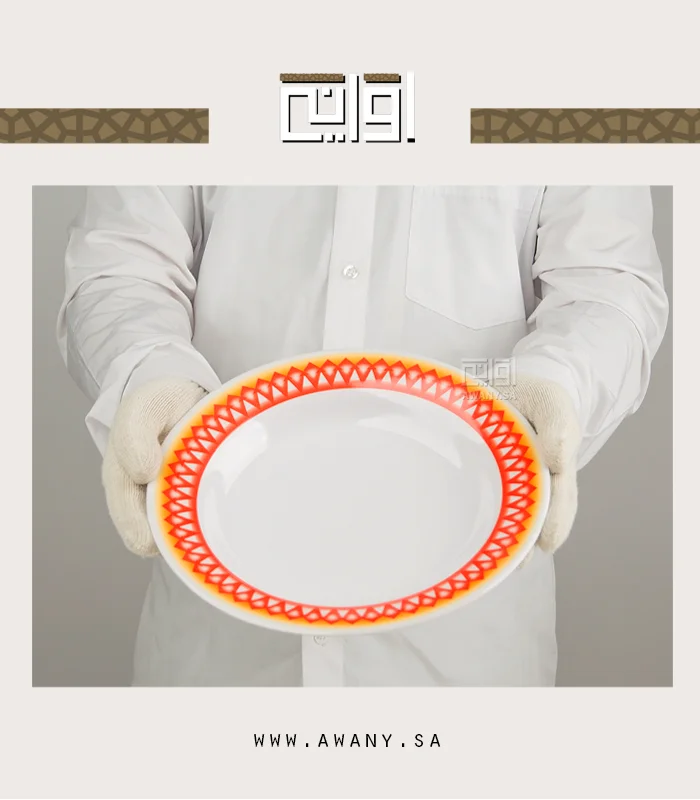 لتكتمل اناقة مائدتك اجعل نقشة الغضار من أولويات اختياراتك، صحن سفرة من الميلامين المقاوم للحرارة، تصميم دائري مقاس 25 سم، بحواف مليئة بجمال نقشة خد المنديل التراثية با اللون الأحمر وبصمة من سحر الأصفر.
