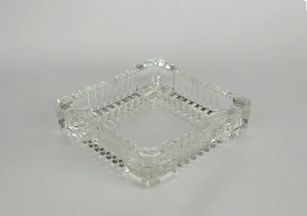 طفاية سجائر عملية وأنيقة، خامة الطفاية من الزجاج القوي، تم تشكيلها بشكل مربع، نحت على أطرافها خطوط بشكل مميز منحتها مظهراً انيقاً وفاخراً.