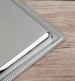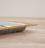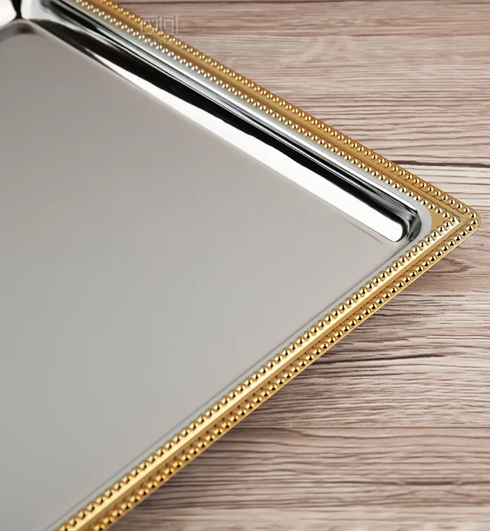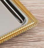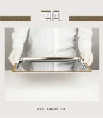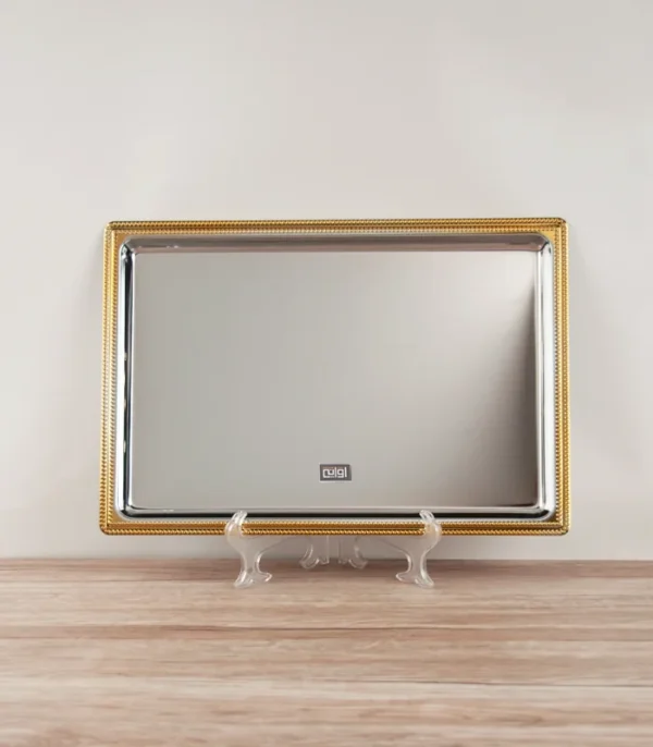 طوفرية الأناقة الذهبية، خامة من الستانلس ستيل اللامع، تصميم مستطيل الشكل، لون فضي لامع بحواف ذهبية بزخارف هندسية خطوط دقيقة، مناسبة لجلسات الشاي الفاخرة.