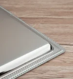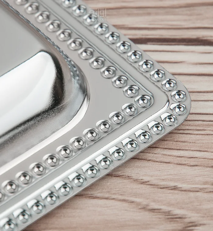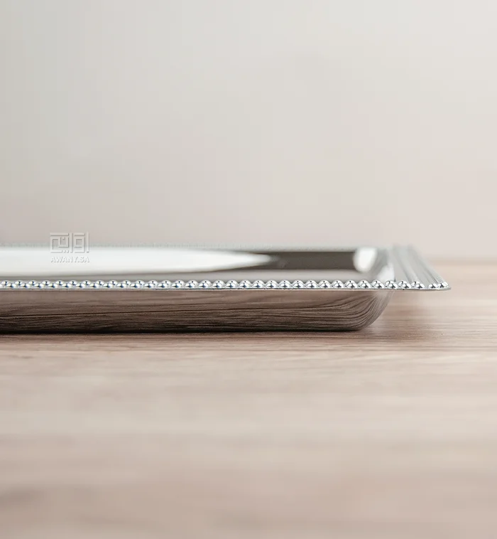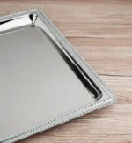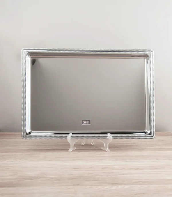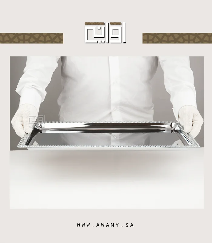 فخامة الستيل حينما تعكس الضيافة صورتها الأجمل طوفرية تقديم، لمسة عصرية، تصميم بشكل مستطيل، حجم كبير، لون فضي بحواف مزخرف، طوفرية تحول ضيافتك الى ضيافة ملكية.