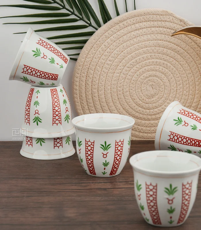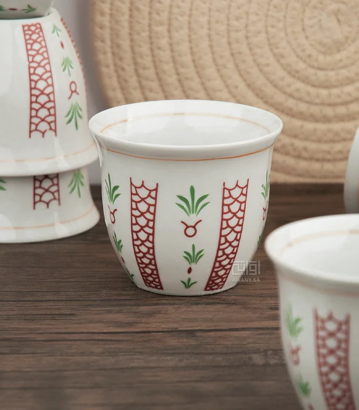 فناجين تراثية للقهوة العربية،خامة من البورسلين، حجم كبير يواجه، تصميم رائع والوان جذابة، نقوش مميزة مستوحى من اشجار النخيل.