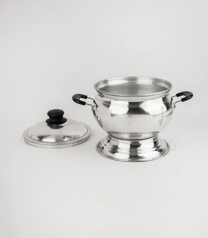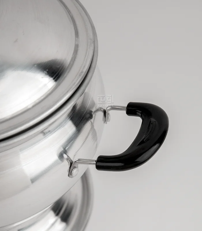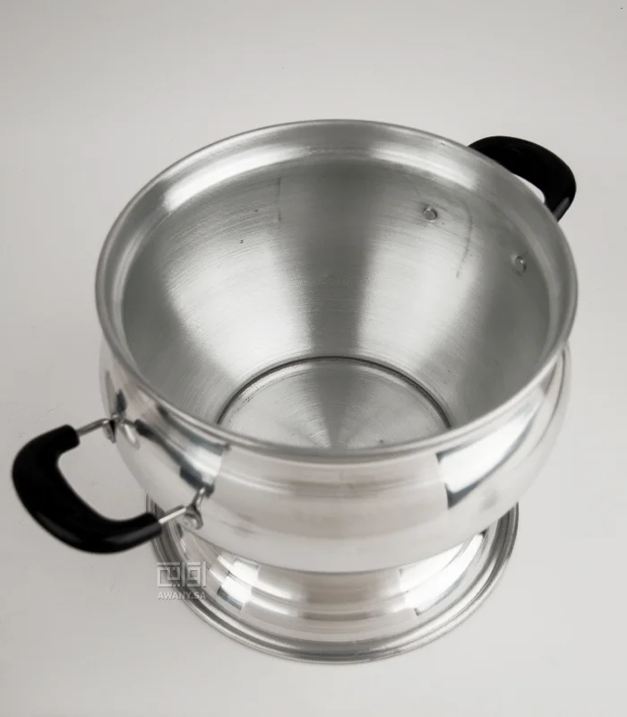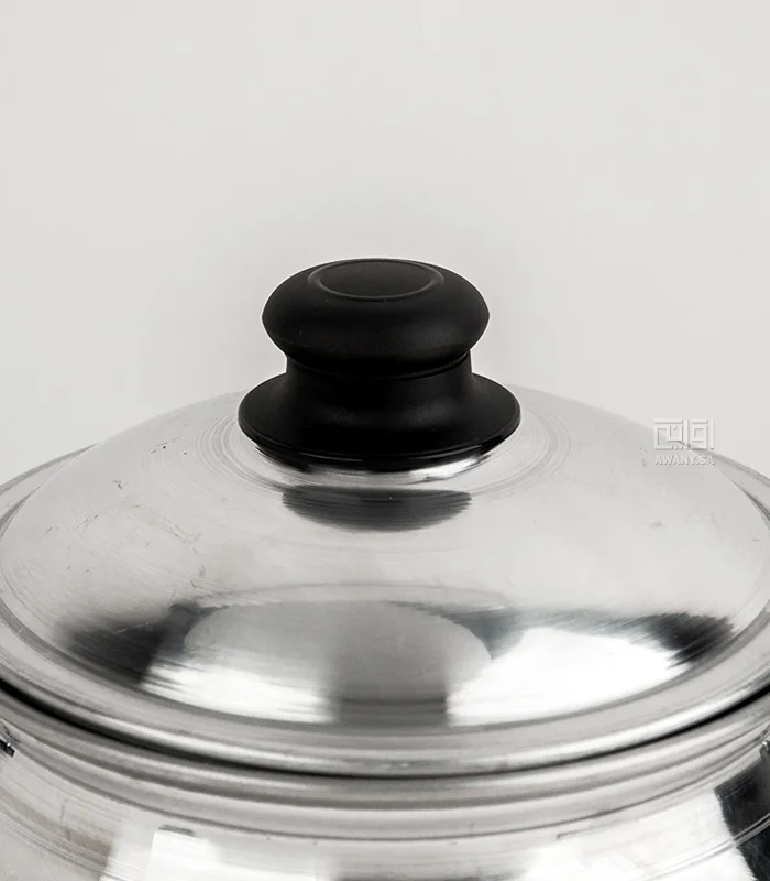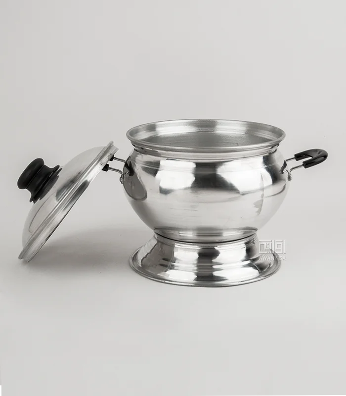 قدر تقديم الشوربة، مصنوع من مادة الألمنيوم، شكل دائري بقاعدة تثبيت، مزود بمقبضين من البلاستيك جانبين لسهولة الحمل والتنقل، غطاء لحفظ الطعام، صمم لتعيشي تجربة تقديم فريدة من نوعها.