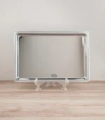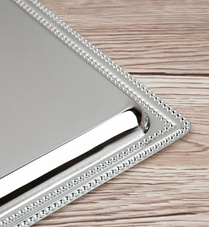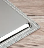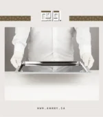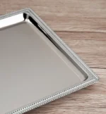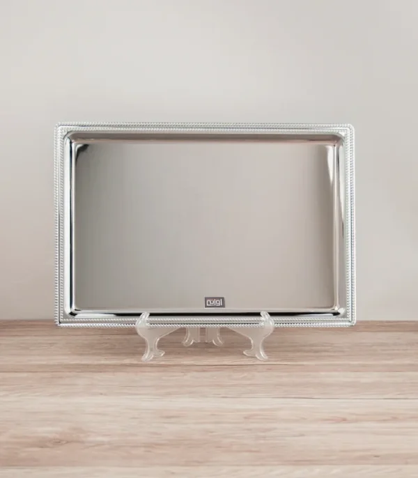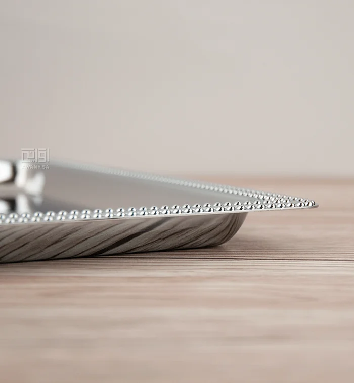 قطعة ستيل أنيقة تقديمها يسبق ما عليها طوفرية تقديم من الستانلس ستيل اللامع، صممت بشكل مستطيل، لون فضي لامع بحواف مزخرفة، مثالية لتقديم القهوة والحلويات.