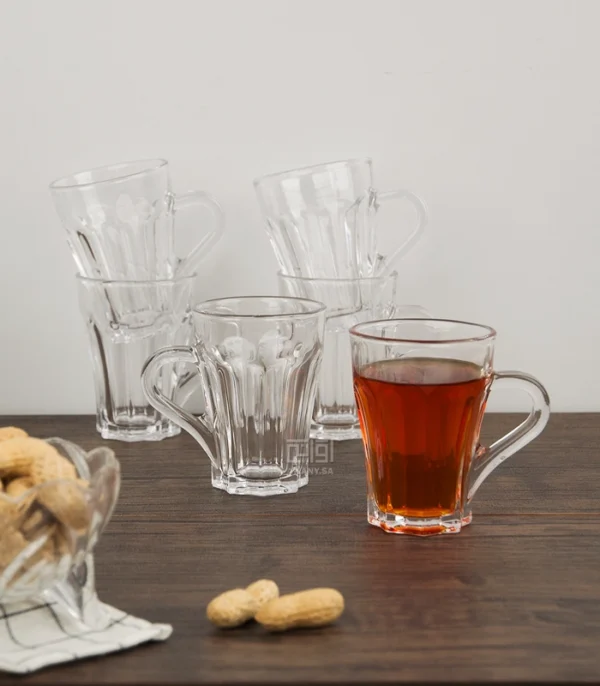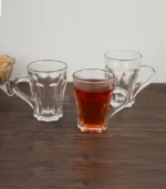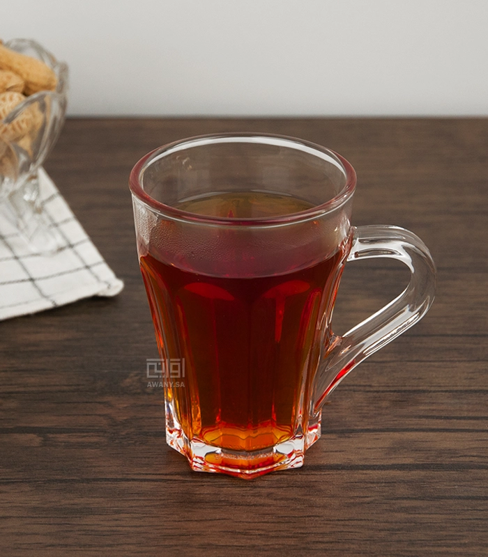 كأس شاي زجاجي شفاف يبرز تفاصيل التلضيعات العمودية التي تمتد على طول جسم الكأس، مسكة توفر لك ثباتاً عند الأمساك، مثالي لعشاق الشاي.