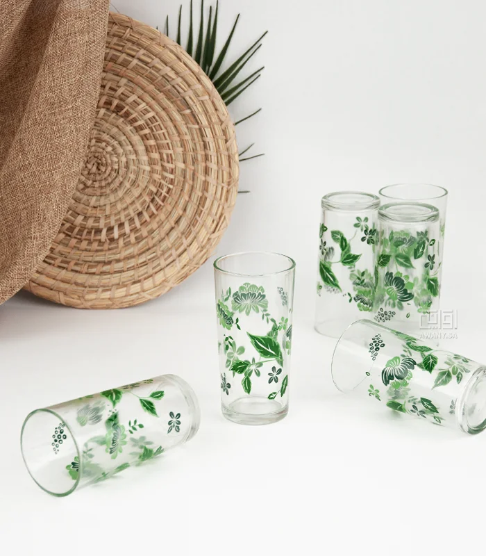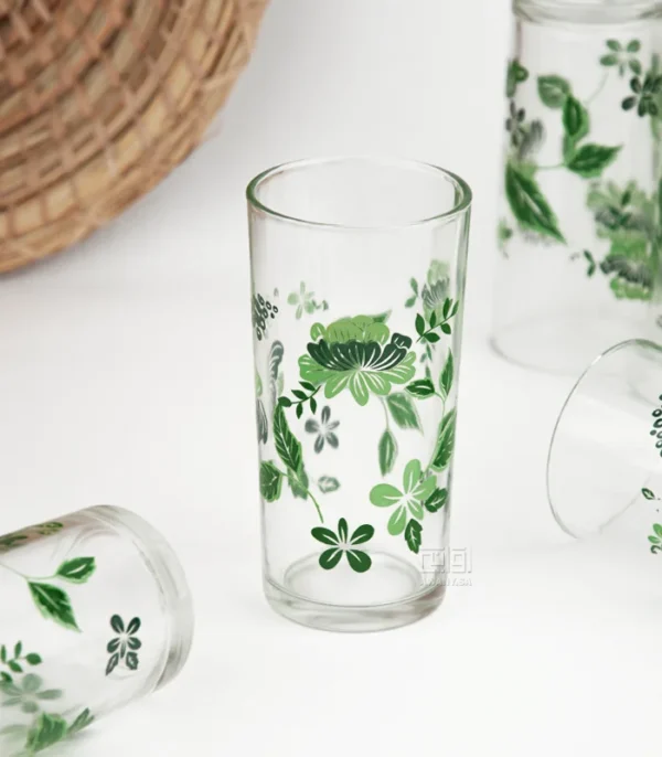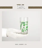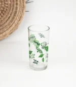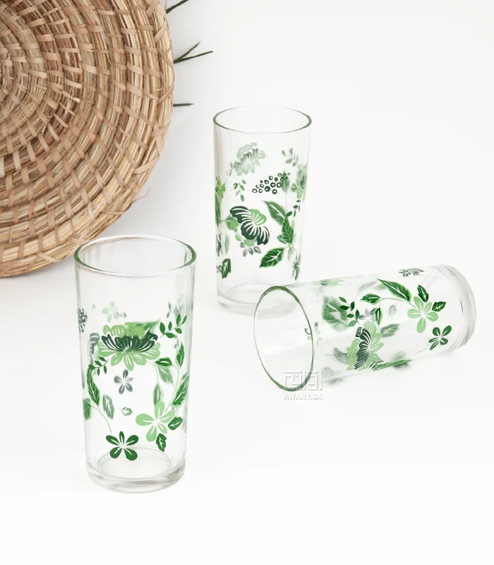 كاسات زجاج بتصميم يلامس الذوق الراقي، كاس زجاجي بشكل اسطواني، شفاف بزخارف نباتية مستوحاة من الطبيعة النباتية، عبارة عن رسومات من أوراق وازهار لمسة جمالية هادئة.