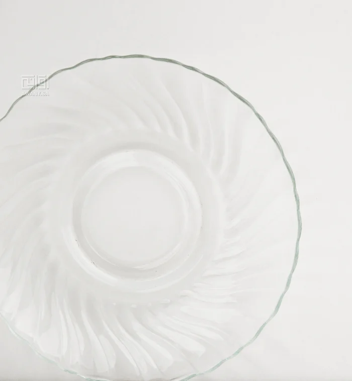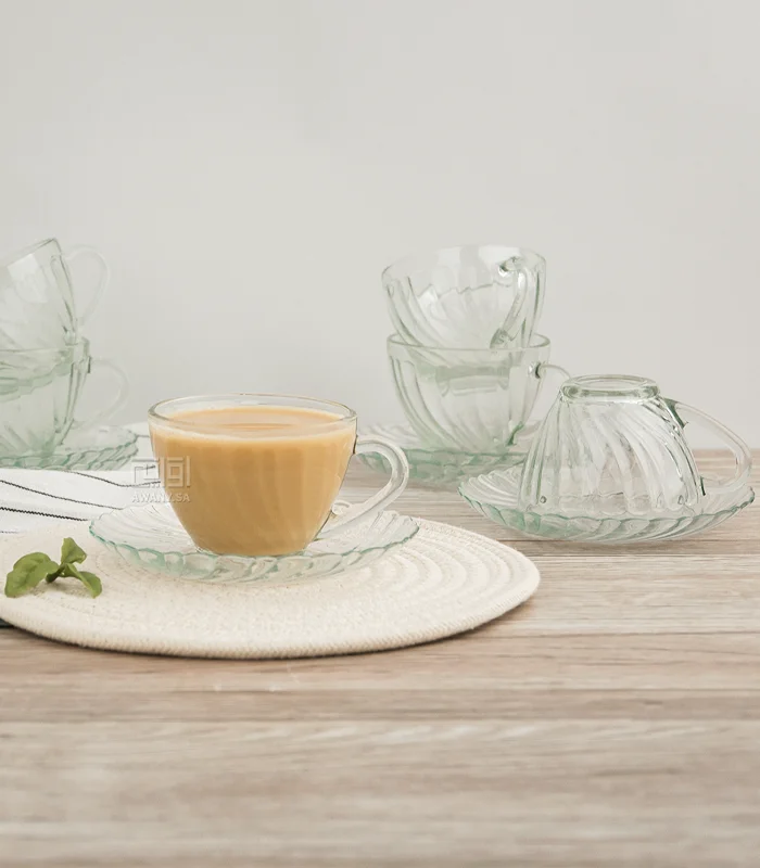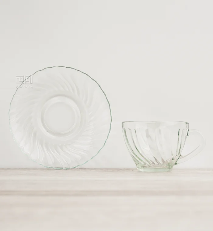 لحظة دافئة قلب مطمئن وكوب لا ينسى كوب زجاجي مع صحن التقديم، طقم شاي زجاجي كوب مع الصحن، تصميم مضلع على هيكل الكوب والصحن، مما يميزه الشفافية التي تبرز لون المشروب وتعكس الضوء بطريقة جذابة.