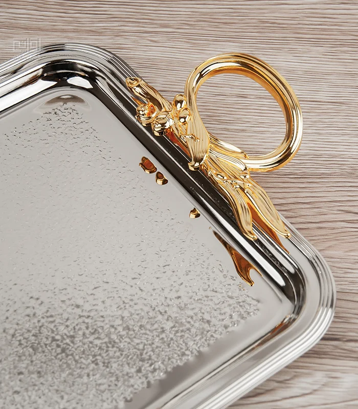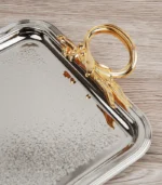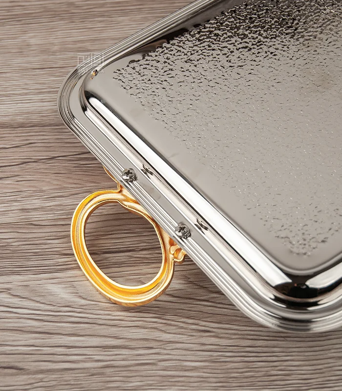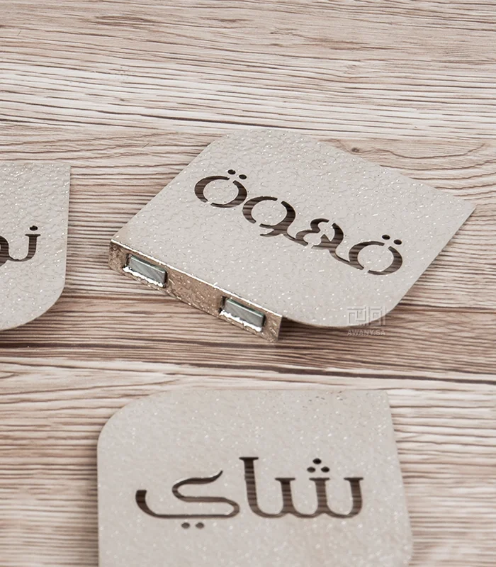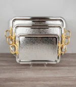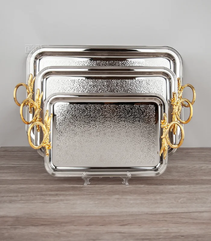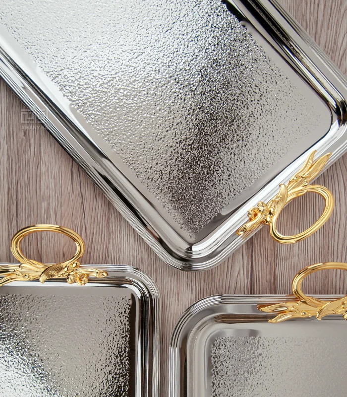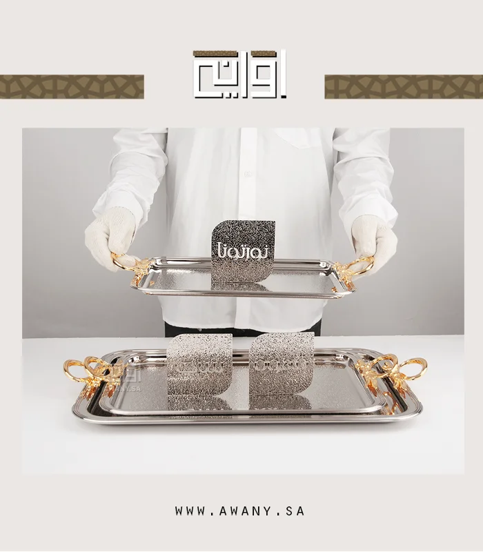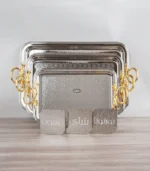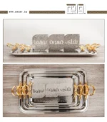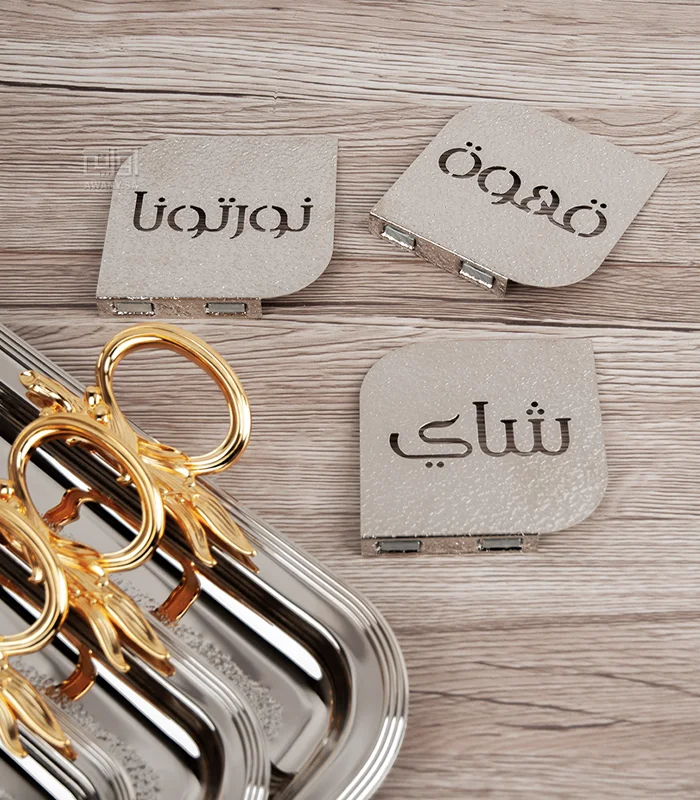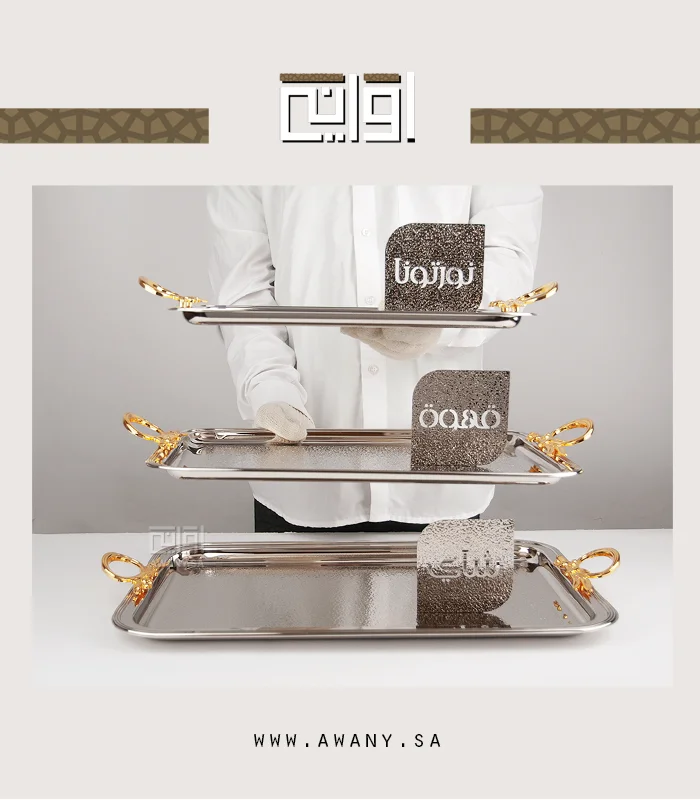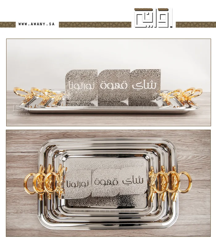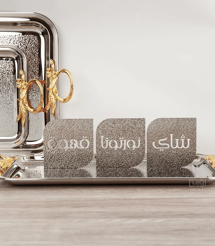 لمسة ذهبية راقية لكل تفاصيل الضيافة طقم 3 طوفريات من الستانلس ستيل، مستطيلة الشكل بسطح منقوش، لون فضي لامع بمقابض تم تصميمها بلمسة فنية رائعة باللون الذهبي الملكي، مزود بفكرة رائعة بطاقات تثبت على الاسطح بقاعدة مغناطيسية بعبارة ترحيبية (نورتونا) وعبارات شاي وقهوة فكرة مميزة تقدم حسب المشروب المفضل.