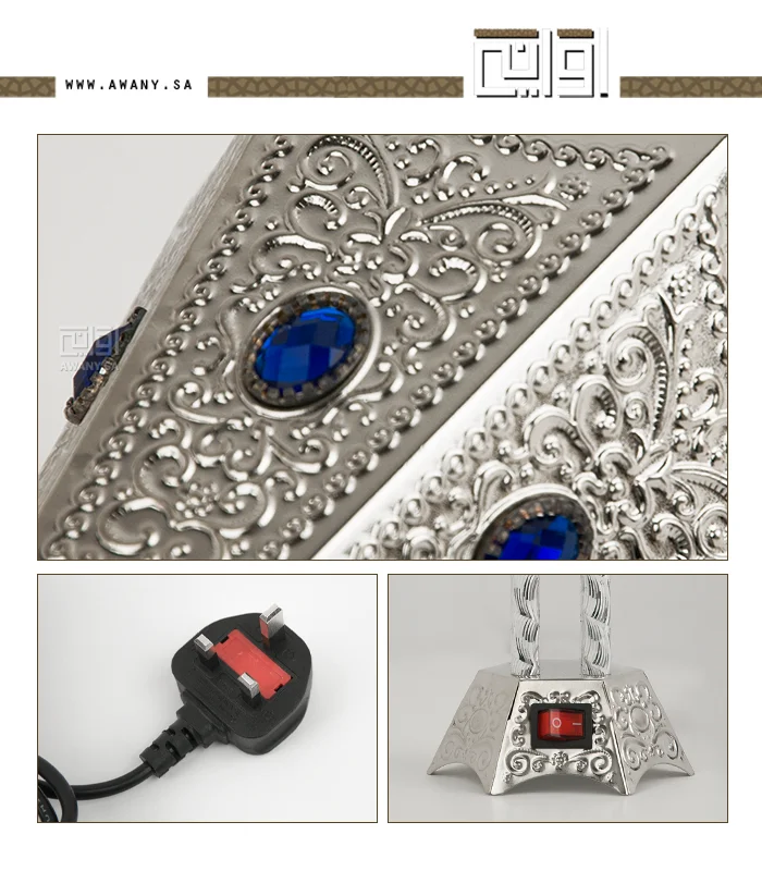 مبخر كهربائي بتصميم عصري يجمع بين الأناقة والفخامة، خامة المبخرة من المعدن، هيكل هرمي يتميز بالزخارف الشرقية على كافة جدار المبخر، مع لمسات من الأحجار الزرقاء، مزود بمفتاح لتشغيل والايقاف، قطعة مثالية لتزيين المجالس.